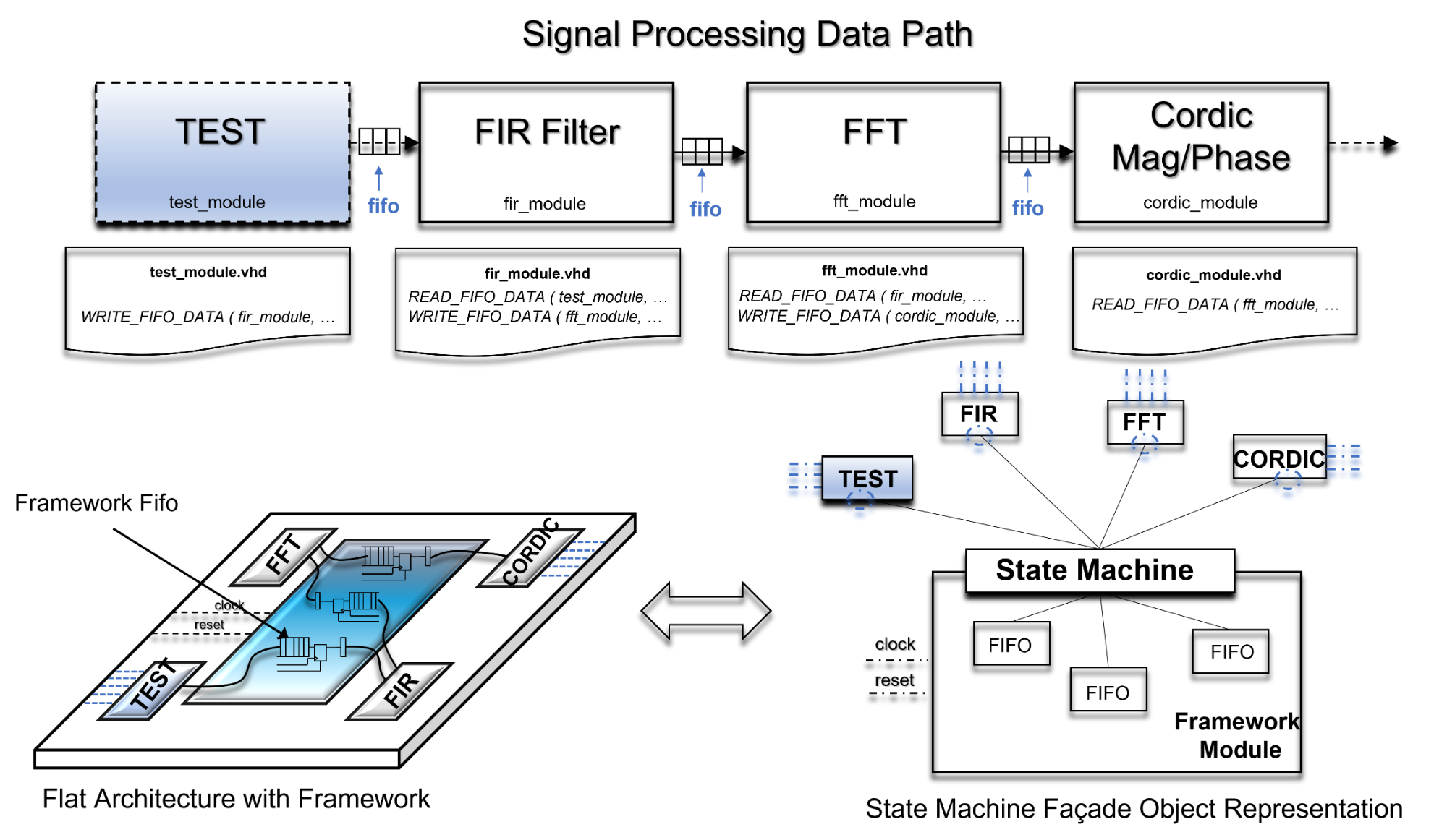 The AXI4-Stream protocol is a standard interface standardized by ARM and used extensively by FPGA vendor IP cores. It is used to stream data from a single producing master to a single data consuming slave. SpeakHDL on the other hand, uses framework fifos to preform point to point communication between application modules. Although a native fifo is not AXI stream compliant, the AXI stream interface and native fifo signaling are very similar, so SpeakHDL makes very easy to interface with IP cores that have the AXI-Stream Interface. This is done by connecting the 'read-side' of the framework fifo, from the READ_FIFO_DATA procedure call to the axi slave interface of the component, and the axi master side of the component to input parameters of the WRITE_FIFO_DATA procedure call.