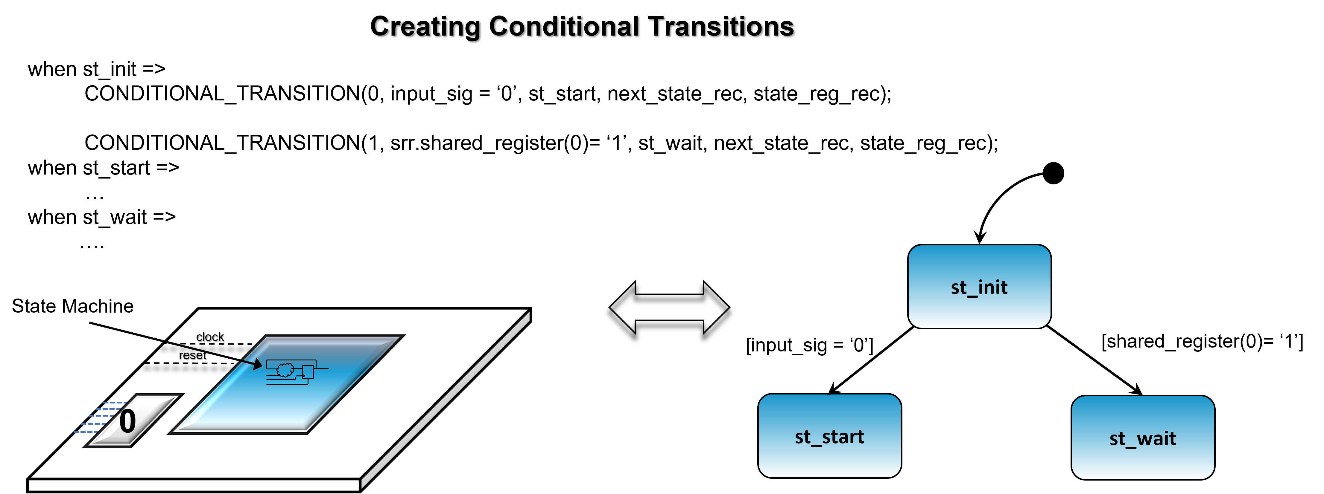 The use case for the CONDITIONAL_TRANSITION procedure calls is to emulate the conditional branching functionality that normally would be coded using if-then-else statements while still staying within the procedural programming paradigm. Inside a process, conditional operations are limited scheduling a state machine transition. This very limited range of operations is by design, and forces all branching operations to be explicitly mapped to a state. Doing so dramatically reduces the amount of debugging time that could result by inferring implicit states using traditional RTL.