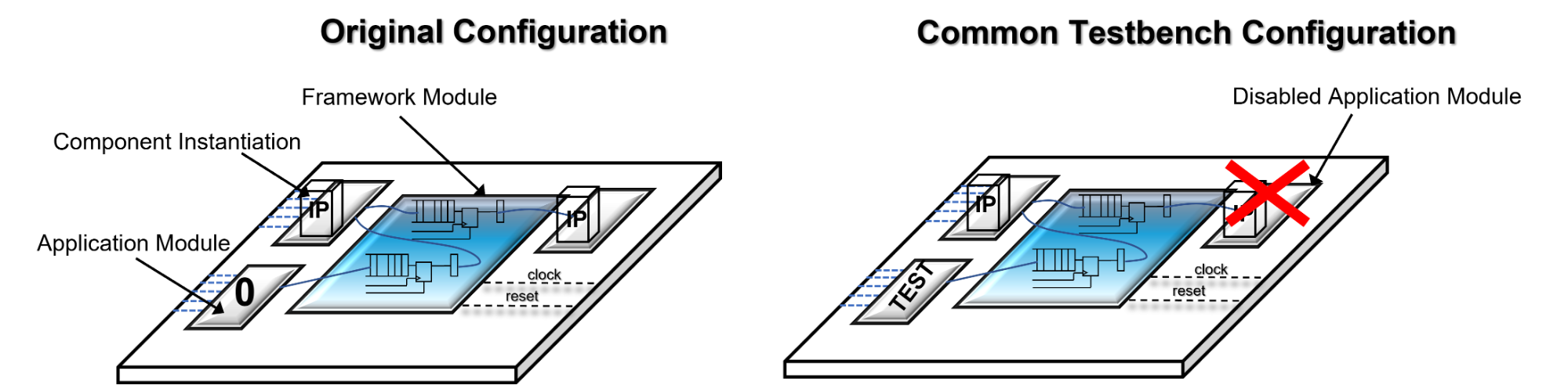 This statement above adds an empty VHDL architecture named 'disabled' to the current entity that will be analyzed last by the simulation/synthesis tool. The net effect is to ignore all the application module logic while keeping the actual .vhd file intact. This can be convenient when designing a testbench for validation. Disabling any non-essential application modules can substantially speed up debugging time while simultaneously cutting down on simulation time. The situation is even more pronounced when a component is instantiated inside an application module. In this case, using DISABLE_FILE will also serve to disable the component from being simulated or synthesized.
