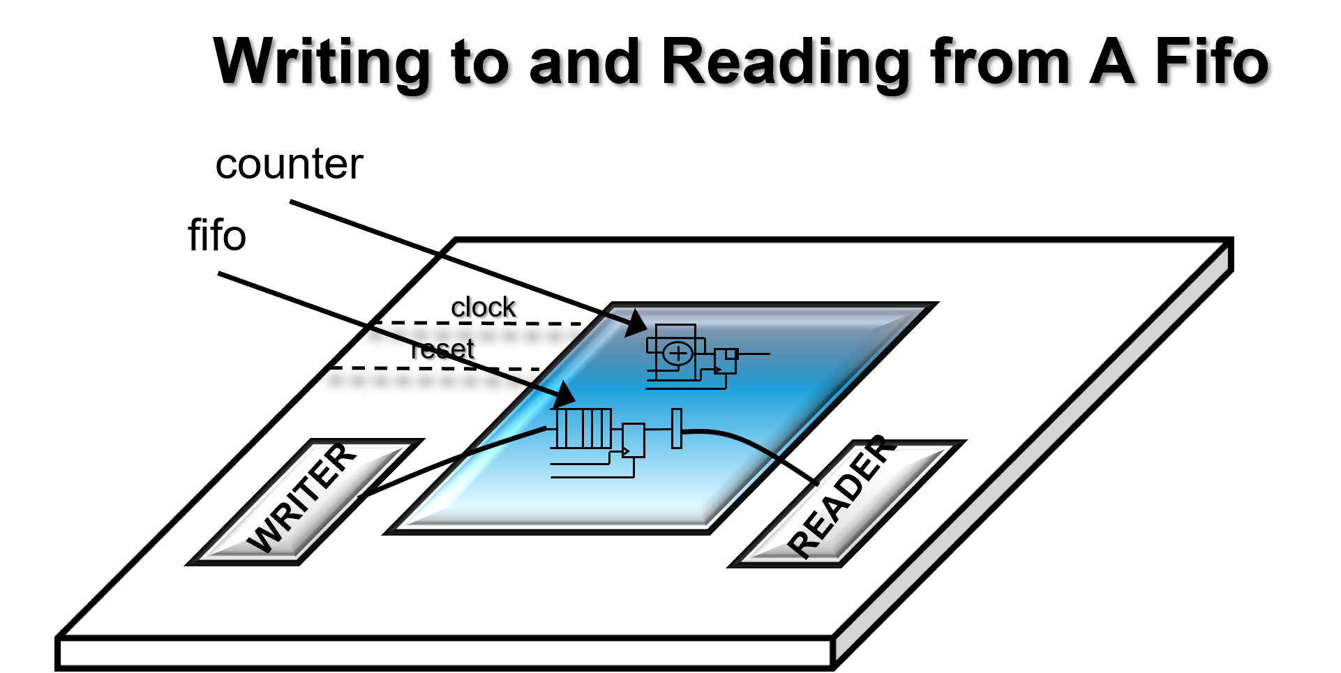 Using the following commands, application module ' writer.vhd ' streams data from counter(0) into a fifo and application module ' reader.vhd ' reads the data from the fifo.  Note that the fifo_write_enable signal is used as the enable for the counter.