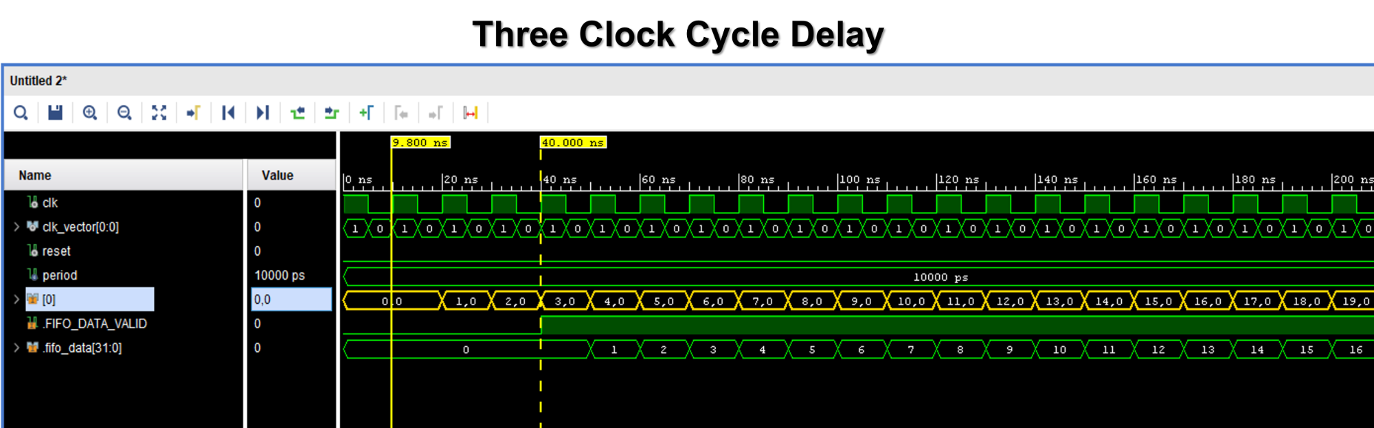 The following commands configure the divide counter (faster counter) to count 1.1us and the slower delay counter to count to 3.  The net affect is a 3.3 us counter that rolls over and starts again, but outputs strobes every 1.1us.  In order to cut down on simulation time, the clock frequency was dropped from 100MHz to 10MHz.