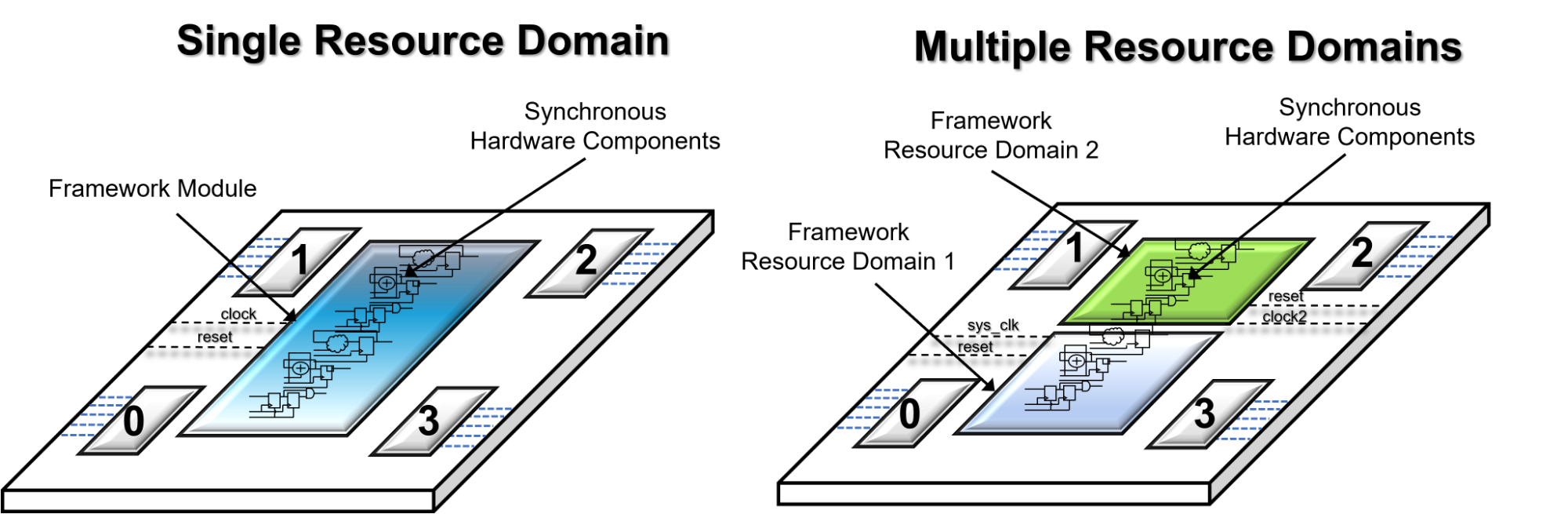 Partitioning of hardware resources is achieved by making multiple calls to RESOURCE_SELECT, each time with a different resource index. This will cause the framework module synchronous hardware components to be assigned to either the SYS_CLK clock domain or different resource clock domain depending on the clock parameter. The resource index must be specified in every API call. If an explicit index is not specified, it is assumed that the API call references the default resource domain 0. Otherwise, the resource index, 'M', must be explicitly referenced in the next_state_rec(M) and state_reg_rec(M) parameters, which are the last mandatory parameters of every API call.