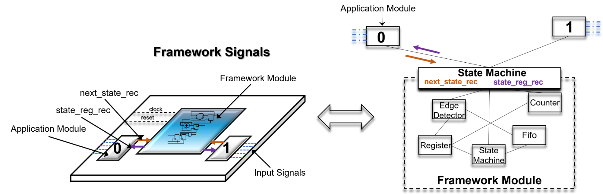 The state_reg_rec signal is a VHDL data structure representing the registered return value of a procedure call. Although the signal name ends with '_rec' which alludes to being a VHDL record type, the signal is actually an array of records. Each resource index of state_reg_rec is made up of approximately (20) VHDL record fields. SpeakHDL refers to the state_reg_rec record fields as framework signals which are used as inputs to application modules and represent a single framework resource that has been configured. Amongst other things, the state_reg_rec signal, contains data structures for hardware registers that include a single left and right shifter, a fifo, and a shared control register in addition to an array of counters, edge detectors, and event vectors, which can be indexed. These hardware registers are essentially 'pre-declared signals' that the developer can immediately utilize and that help facilitate productivity.