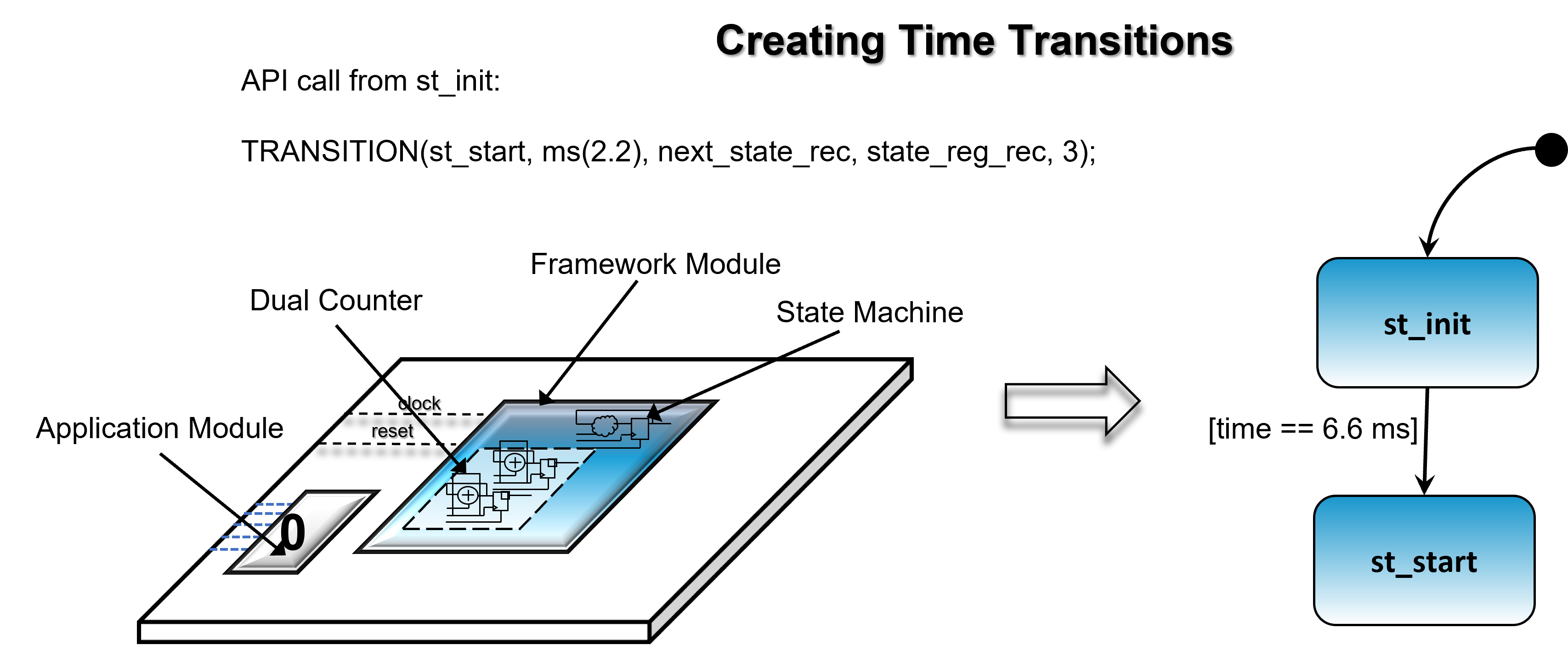 The TRANSITION procedure call schedules a state machine transition to occur after a specified time duration. To achieve a timed transition, a dual hardware counter is used as a state_timer by configuring the counter to increment every clock cycle. The user specifies the desired state of the transition and the number of clock cycles that the hardware counter should count before rolling over and triggering the transition. The timer_count value can be specified as either a constant integer or a timing function, us(), ms(), or sec() that evaluates to a constant integer. When a timing function is used, the number of clock cycles that the hardware counter counts before a transition is calculated based on the clock domain frequency.